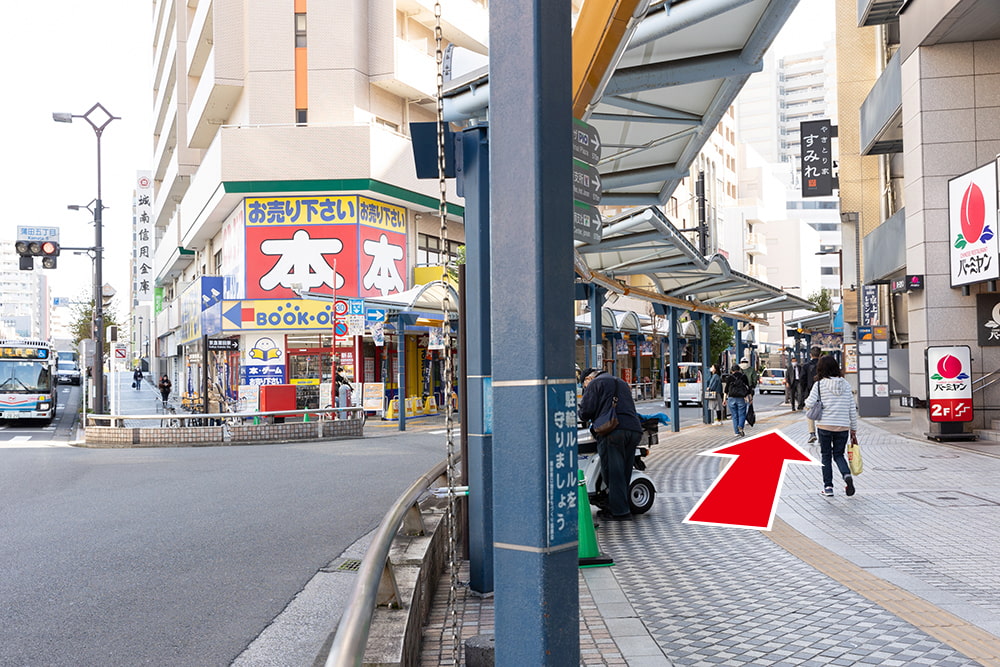 商店街を突き当りまで進んだら、正面にある横断歩道を渡ってください。